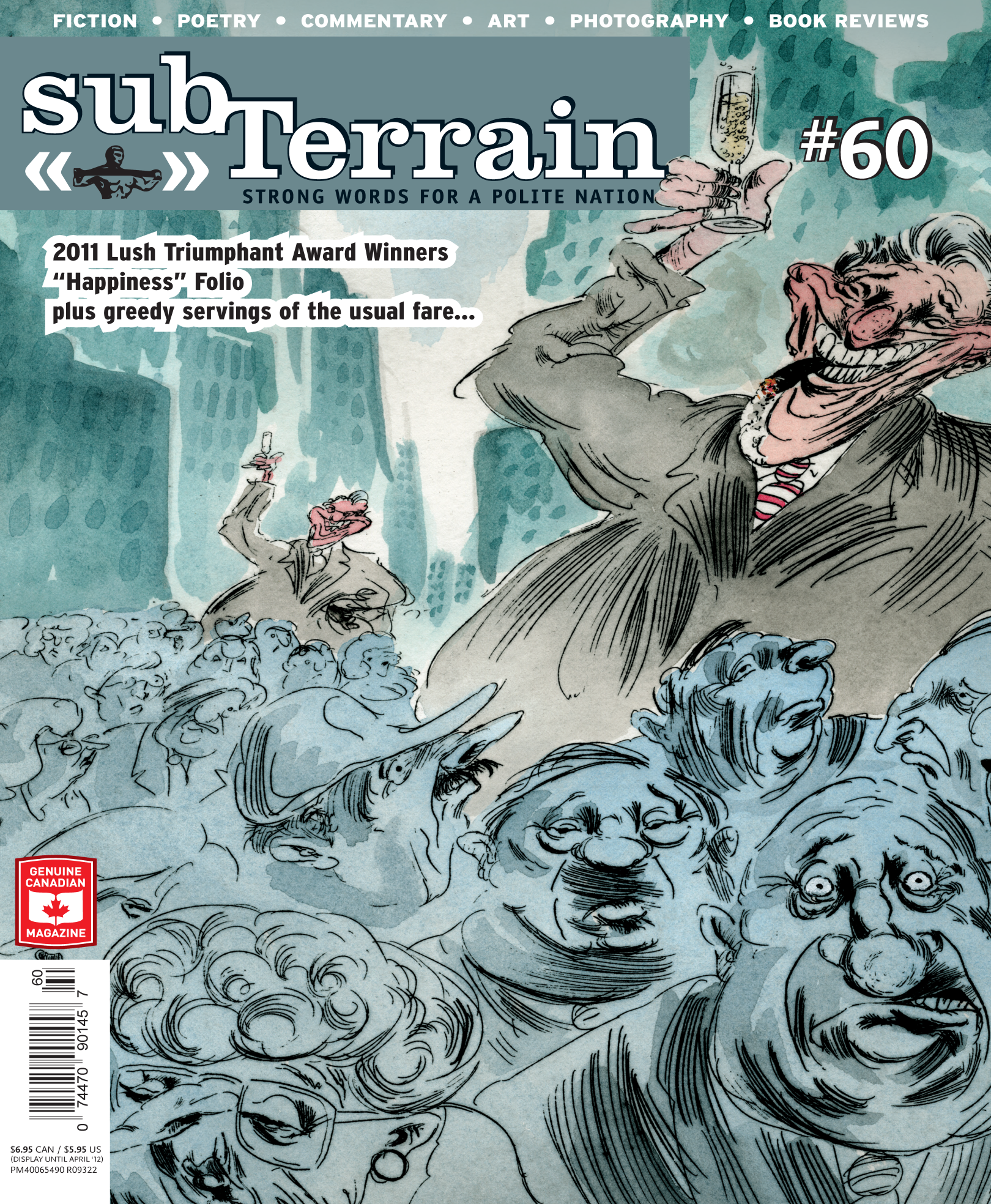 Issue 65 features fiction from Elaine McCluskey, George Bowering, Yasuko Thang, Grant Buday, Heidi Greco, Craig Davidson, and Mark Anthony Jarman; poetry by Dennis E. Bolen, Tammy Armstrong, and George Stanley; and anniversary memories from Peter Babiak, Patrick Mackenzie, Jim Oaten, Jenn Farrell, Heidi Greco, and Tammy Armstrong.
